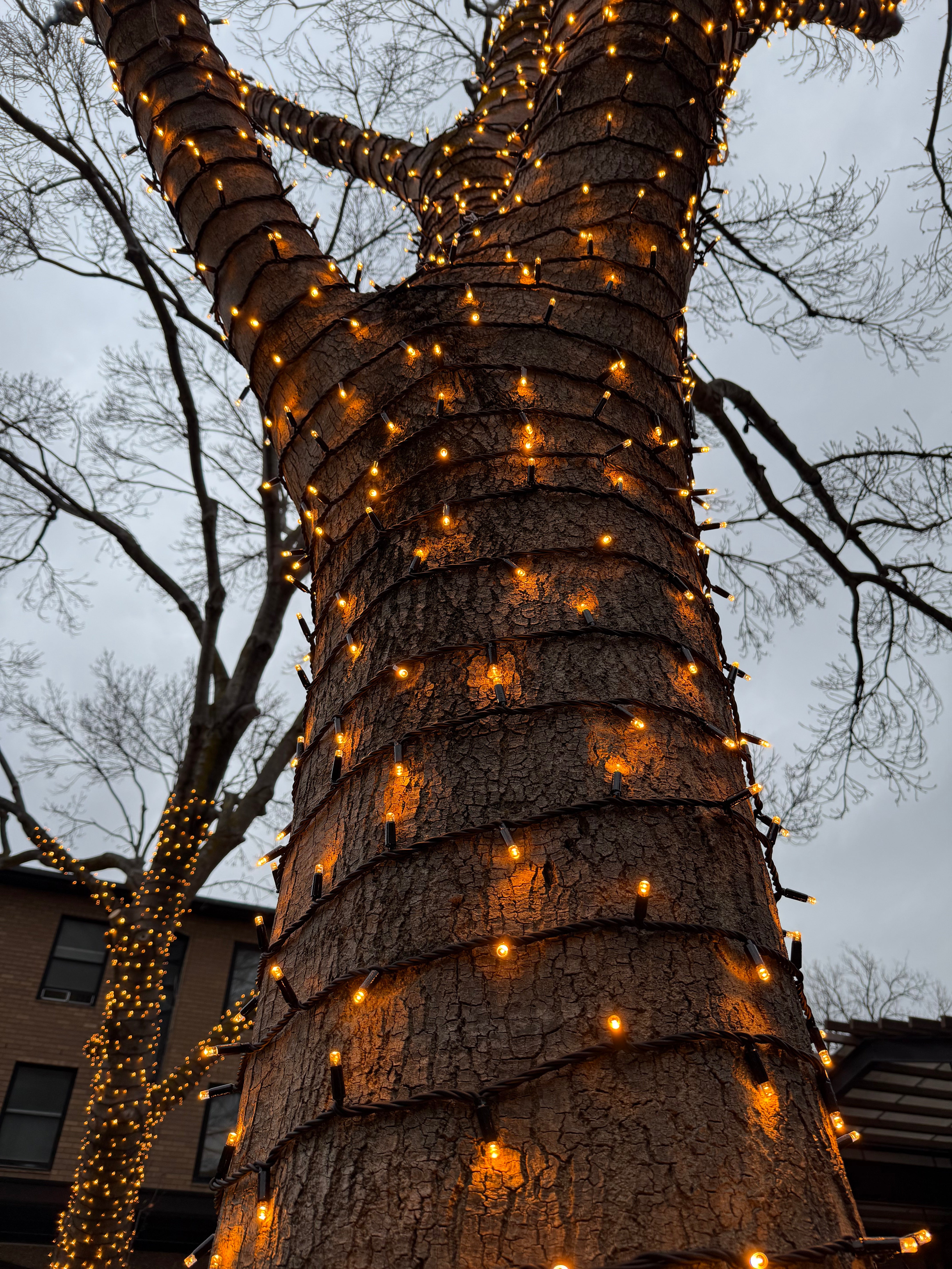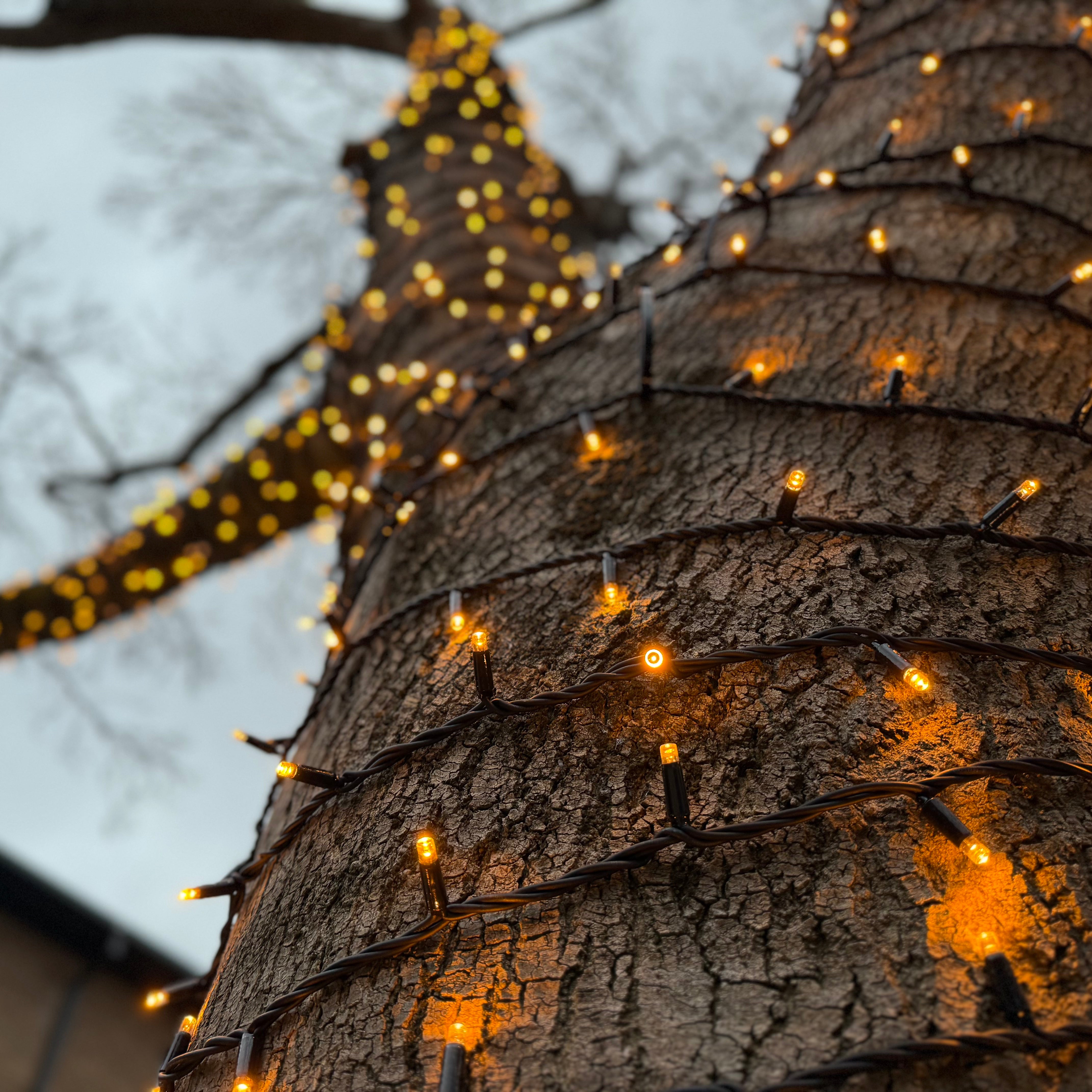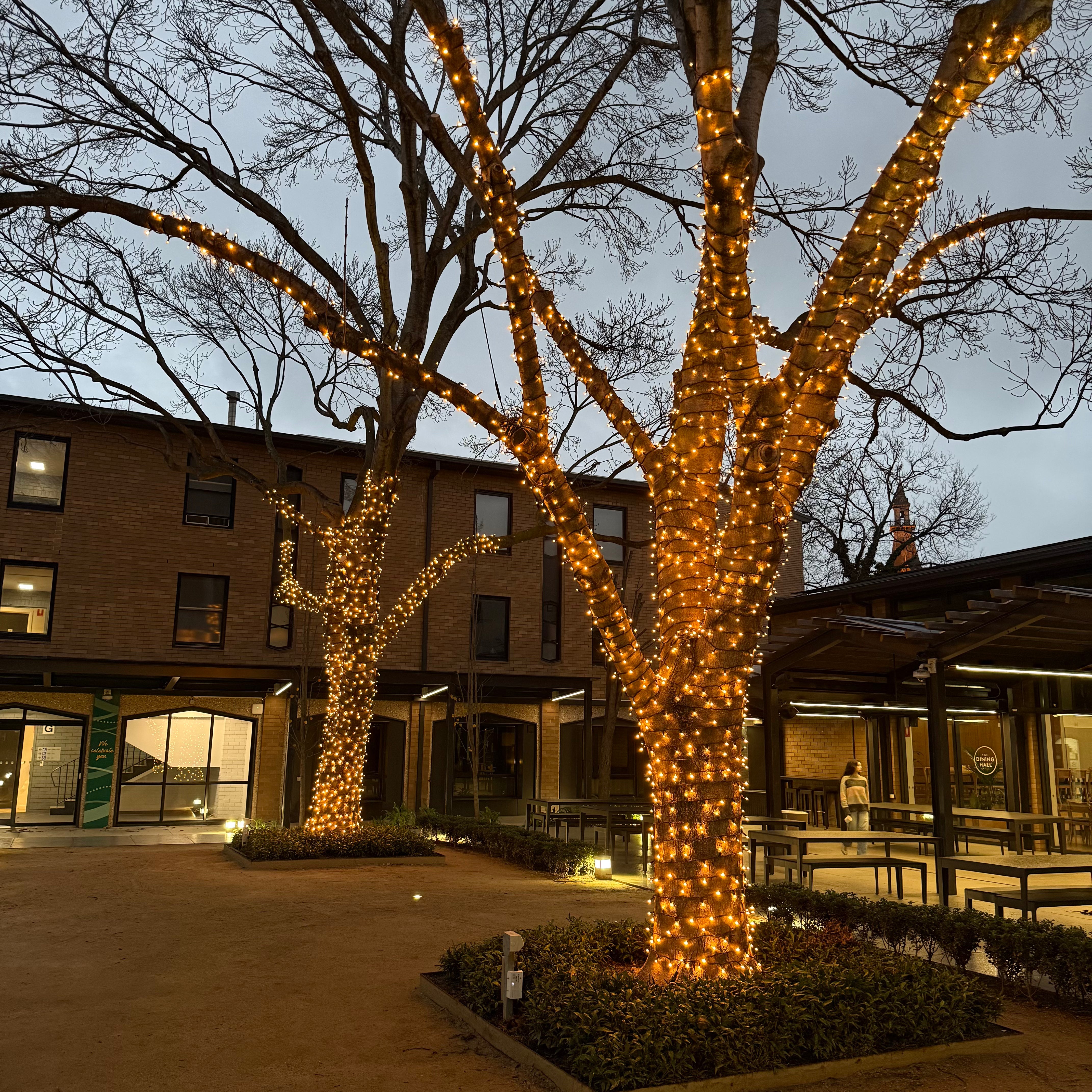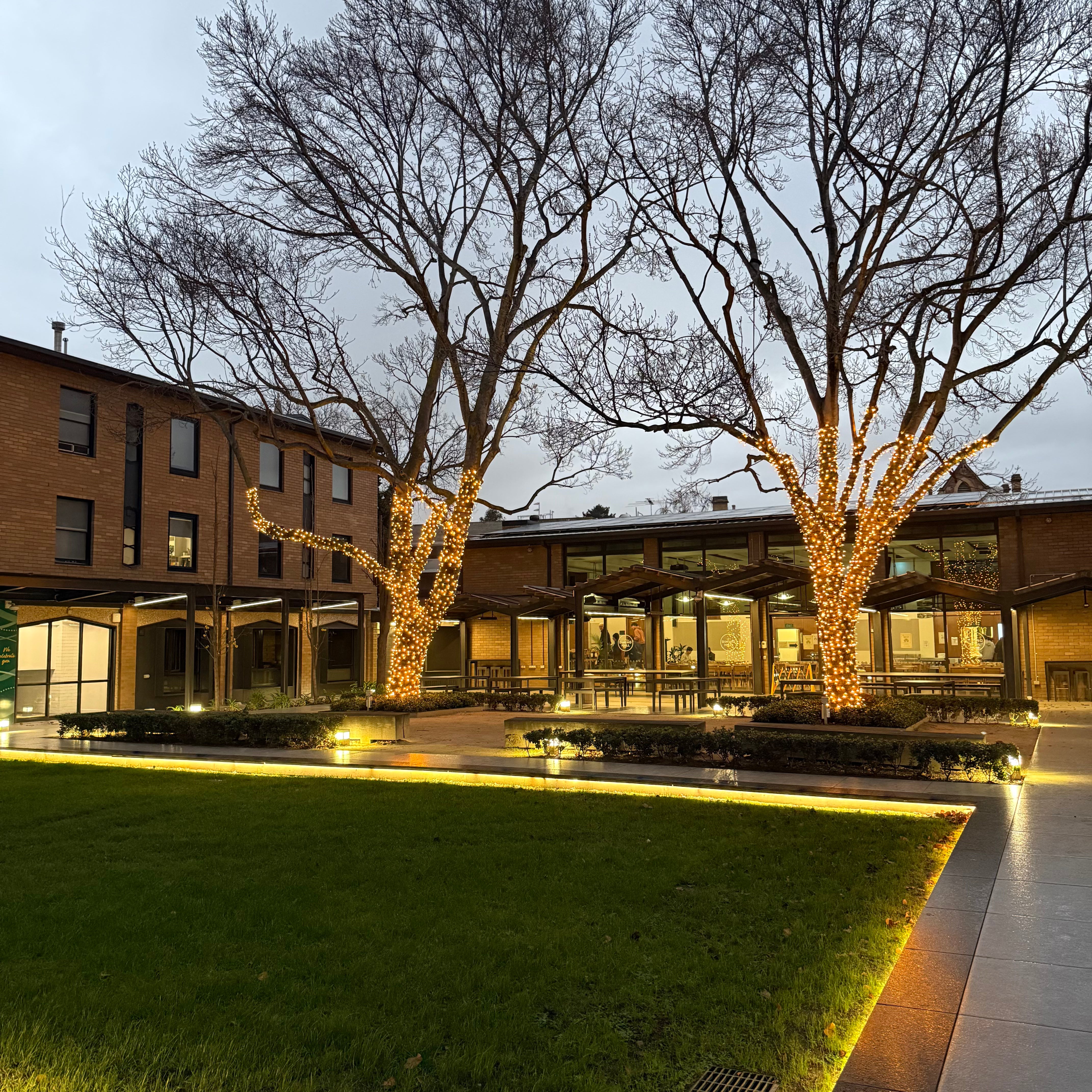 The courtyard is now a softly glowing, inviting space — perfect for evening events, quiet study sessions under the stars, or simply enjoying the atmosphere. As with every project, we prioritised longevity and safety: using our IP65-rated fairy lights and secure techniques to ensure the installation complements the tree’s natural growth over time.