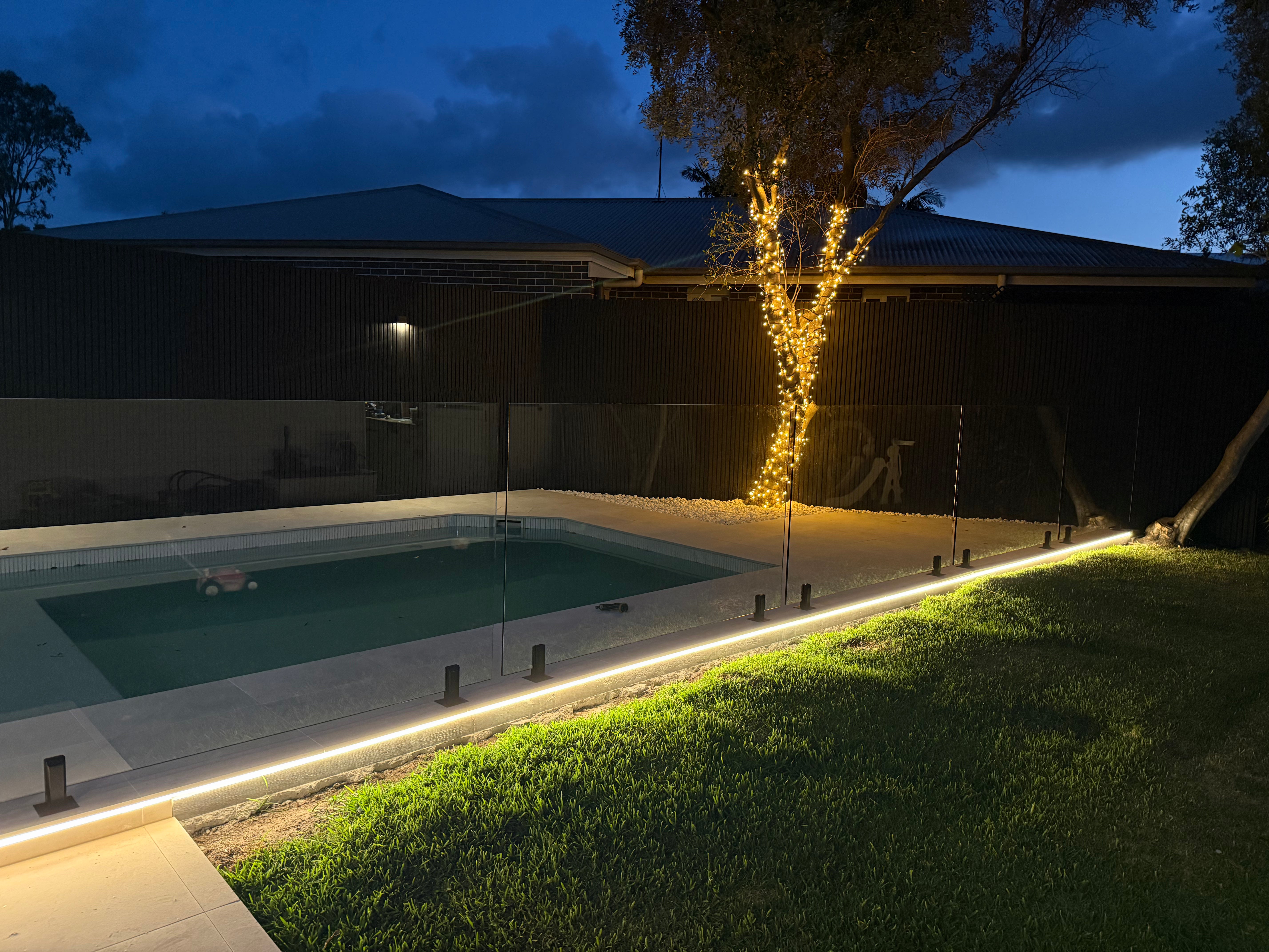 In this residential project, we combined two of our favourite products to transform a poolside space. Our 10x10mm Tri View Warm White flexible neon was installed to shine out across the grass, creating a clean architectural glow beside the pool.