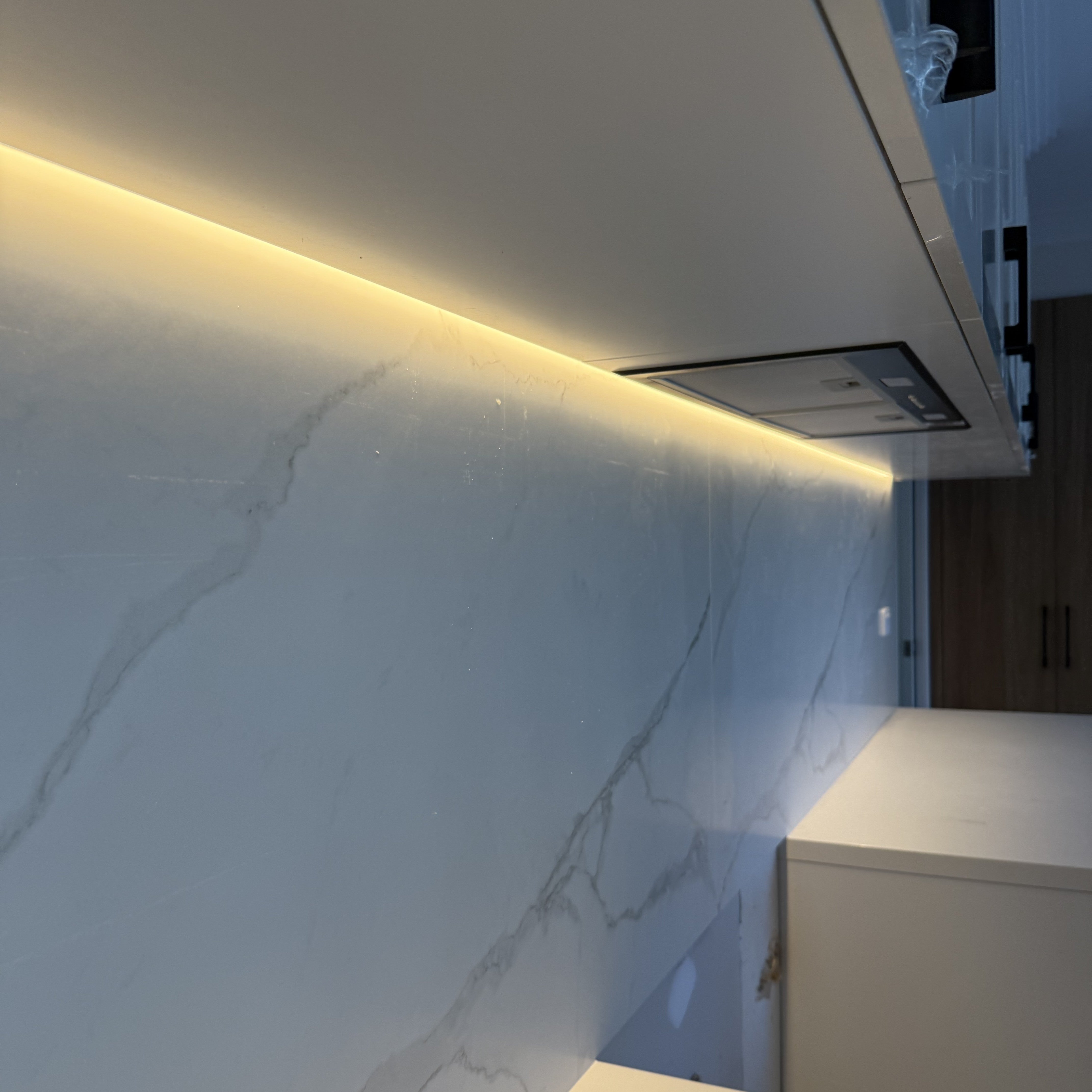The soft 3000k colour temperature adds warmth to the crisp lines of the kitchen, balancing function with ambience. Itβs the kind of lighting detail that elevates everyday living, proving that even subtle additions can make a big design impact.